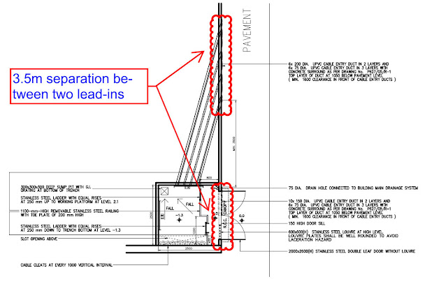 a)應為變電站的電纜上升室/電纜井提供兩個獨立的電纜入口,相距至少3.5米。電纜溝/坑用土回填時應能承受其重量。
